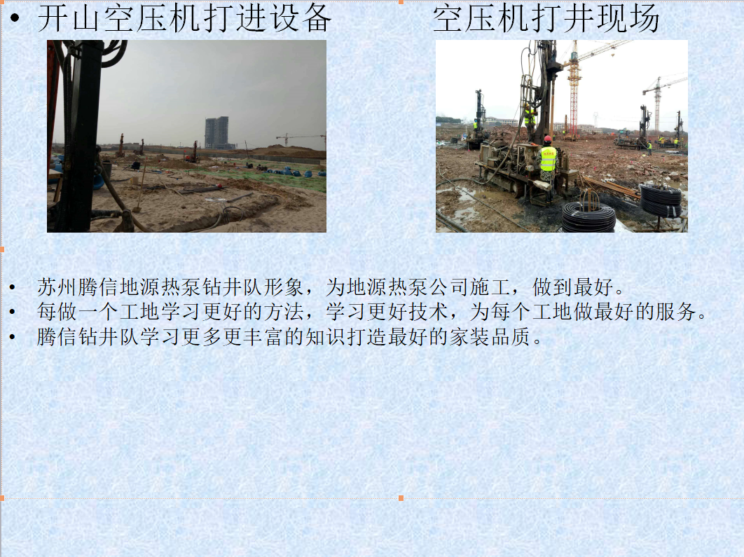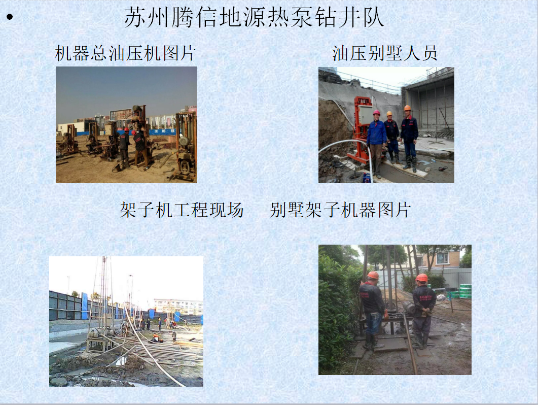 江蘇姜氏地源熱泵安裝工程有限公司成立于2006年,具有多年的地質(zhì)鉆探經(jīng)驗,并于2008年開始熱誠地源熱泵室外地埋管鉆孔施工,至今在江蘇、浙江、上海、安徽等地都有輝煌業(yè)績,公司本著誠信、努力、創(chuàng)新的經(jīng)營理念,期待著與各界朋友合作 公司具有機械鉆井隊伍,專業(yè)開鉆各類大中型深井、工程降水井以及地源熱泵井、冷風(fēng)機安裝等多項業(yè)務(wù)。我們憑借專業(yè)的知識和多年的施工經(jīng)驗、先進齊全的機械設(shè)備、合理的價格 、優(yōu)質(zhì)高效的服務(wù)始終置立于行業(yè)的前沿。 目前公司擁有SPJ-500型水井鉆一臺、SPJ-300型水井鉆二臺、取石鉆機一臺(可取500米深)、SPJ-150型三臺、SPJ-50型五臺、輕型井點降水設(shè)備200套。滿足企事業(yè)單位用水量4-400噸/小時。