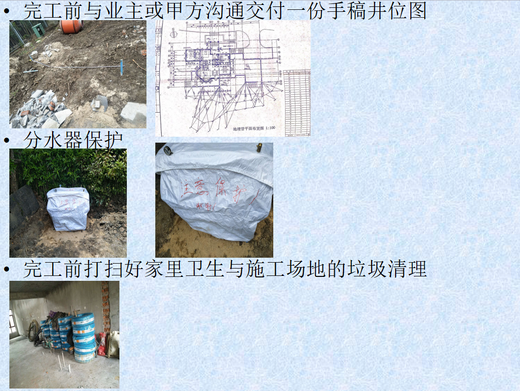 5.3回填完后將留在地面的管道管口進行封堵保護并進行標(biāo) 記,防止后續(xù)施工造成損壞。